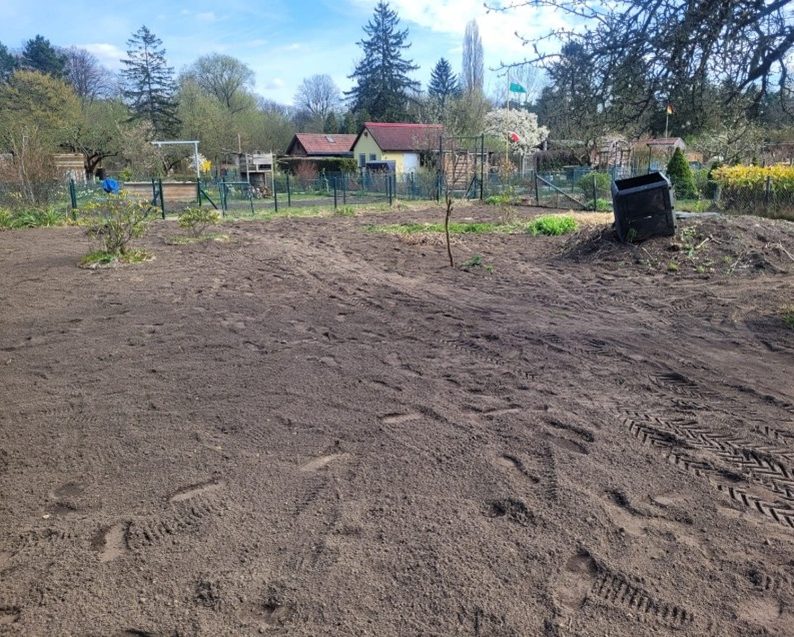 Das Aufschütten mit Mutterboden im April brachte einen ersten großen Schritt zur Wiederherstellung der Nutzbarkeit der Parzelle.