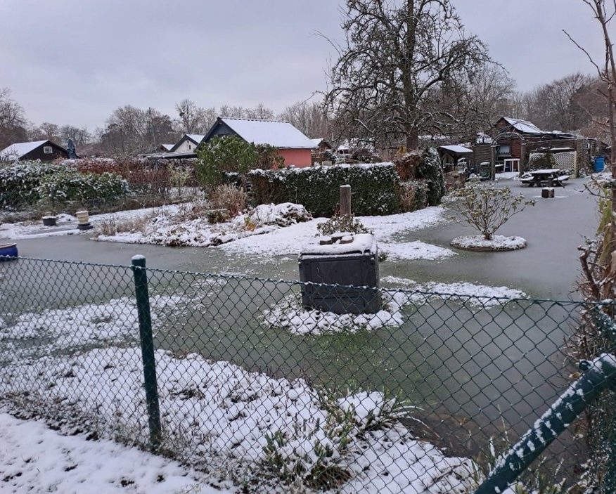 Nach dem verheerenden Hochwasser an Weihnachten 2023 zeigten sich die Spuren in der Parzelle 33 erschreckend deutlich: zurückbleibende Wasserflächen die gut die Hälfte der Parzelle bedeckten und eine Gartenlaube die nicht mehr zu retten war. Die Baustruktur war zu stark beeinträchtigt, sodass nur noch ein Totalabriss in Frage kam.